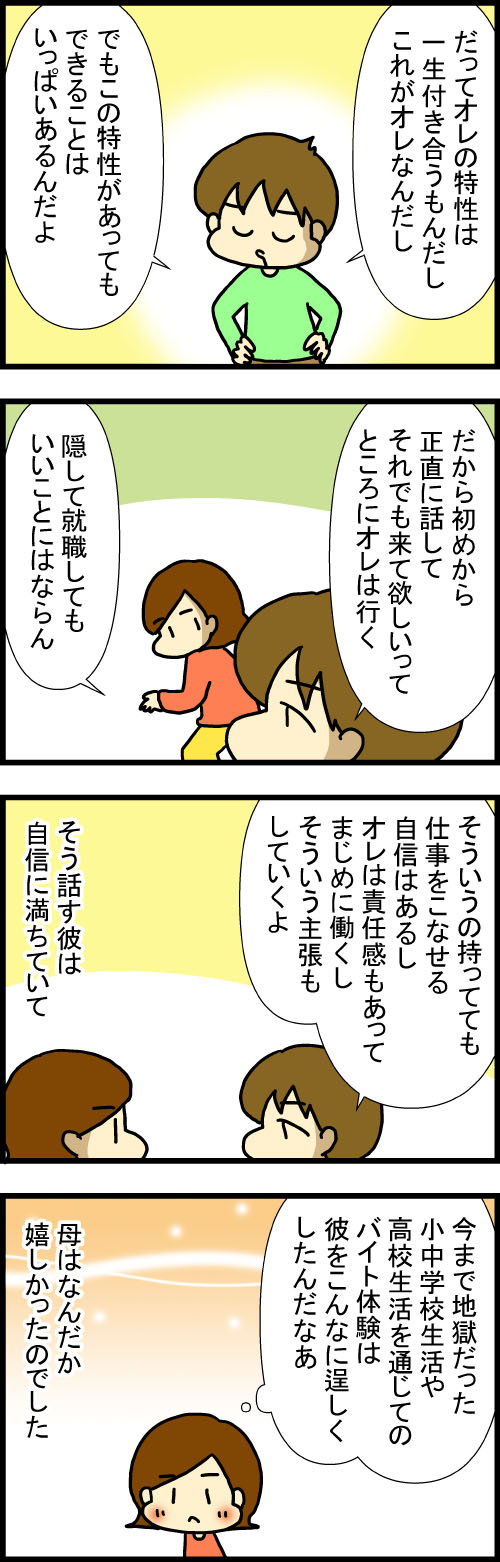 特性持ちの高3息子が選んだ進路(全26話)高校生で経験したバイトは、ファーストフードとお弁当屋さんどちらも自分の特性を伝えることなく始めてしまったのは彼自身にとてつもない「劣等感」があったからファーストフードで理不尽な目にあって辞めた経験とお弁当屋さんで自分 ...
