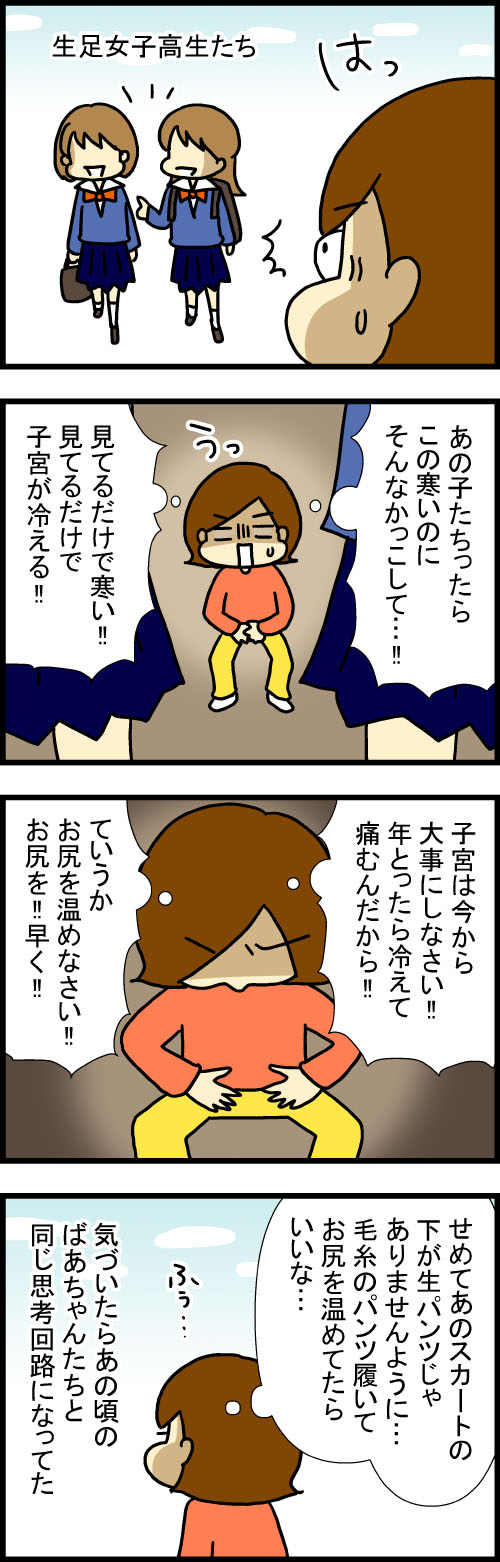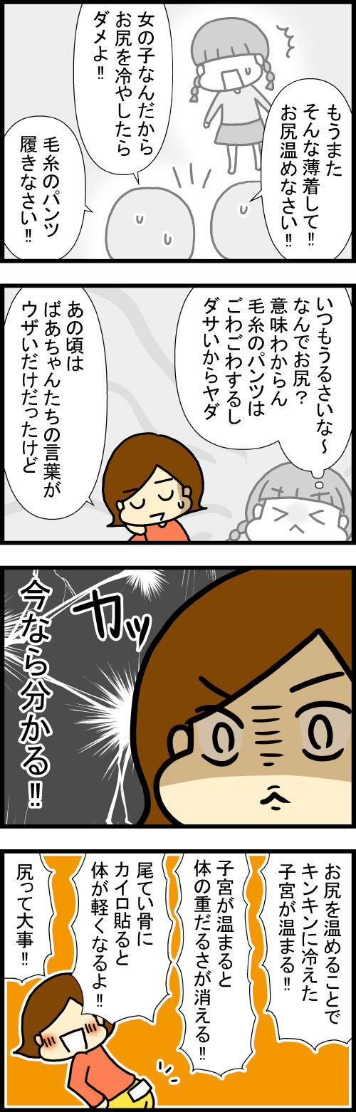 私はカイロを箱買いしてお腹とお尻に貼ってます。