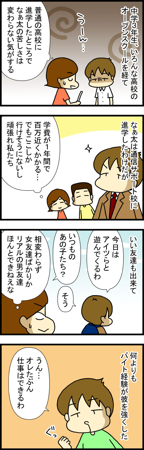 不登校児が大人になるまでの話(全137話)「午後の活動に参加しません その分バイトに出ます」というなぁ太の訴えに勉学と同じくらいバイトを推奨している通信サポート校は快く了解してくれたわけだけれどそういう融通がきくのもまた通信サポート校の良いところだと思うのです ...