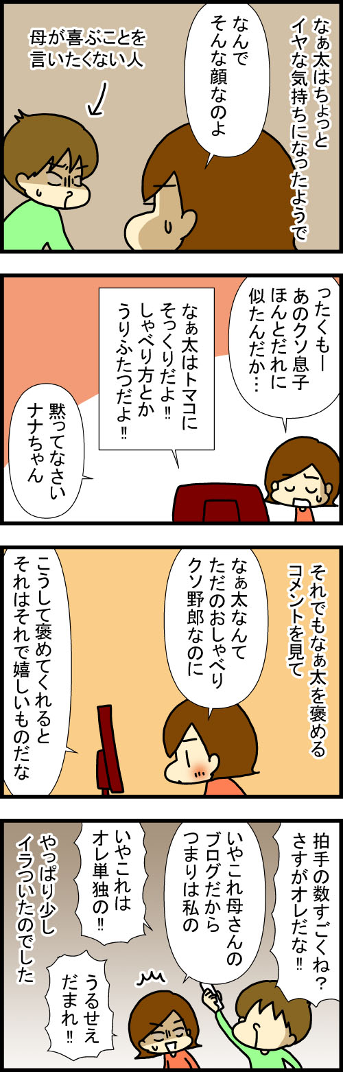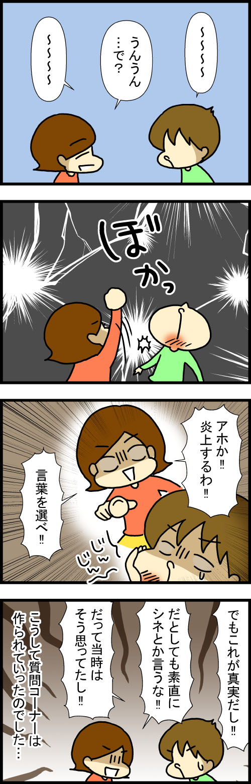 質問コーナー裏話(全4話)暴君なぁ太がかつて理解のない周囲に向けて思った言葉をそのまま素直に口にするものだからNGワードが山のように…!!「言葉を選ぶこと」をこんこんと教えそうして出来上がったのがあの回答だったのでした…あれでもなぁ太なりに言葉を選んでいるのだ ...