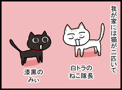 ①猫と子どもの関係-黒猫に隠された能力 2020年10月16日 我が家には猫が二匹いる11年前に拾った白トラのねこ隊長と →2009年の出会い2年前にコン吉が拾ってきた黒猫みぃこの黒猫みぃが!!!暗い色のものに擬態しまくるんだが!!!どうにかならないだろうか!!!みぃだと思って微笑ましく見つめていたものが黒い衣類だった時の衝 ... 続きを読む 我が家には猫が二匹いる11年前に拾った白トラのねこ隊長と →2009年の出会い2年前にコン吉が拾ってきた黒猫みぃこの黒猫みぃが!!!暗い色のものに擬態しまくるんだが!!!どうにかならないだろうか!!!みぃだと思って微笑ましく見つめていたものが黒い衣類だった時の衝撃暗い色のカーペットにみぃが溶け込んでいてそれを踏んでしまった時の衝撃しかも踏まれたのに鳴かない叫ばないまん丸の目でただジッと見つめるアイツほんとに猫なのか「黒猫はトカゲと同じく擬態動物である」この説を声高に唱えたい今日この頃なわけだが今回はこの黒猫みぃと我が家の問題を抱える男たちのお話を少しだけしていこうと思います実は2年前に書いた黒猫みぃの話をの続きをやっと描くんだったりする →黒猫みぃ(全9話)続く 【ランキング】押してくれると描く励みになります! 【更新連絡を受け取る】更新通知が届くよ! 【Instagram】過去の記事を掲載してるよ!【発売中の書籍】発売中の書籍をご覧になりたい方はコチラをクリック →お仕事情報 タグ :#マンガ#8コマ